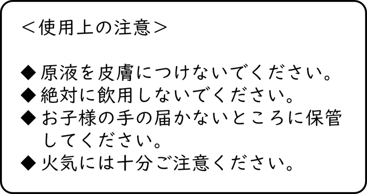 ・本品の原液を飲んだり、肌に直接つけないでください。希釈したものでも飲まないでください。