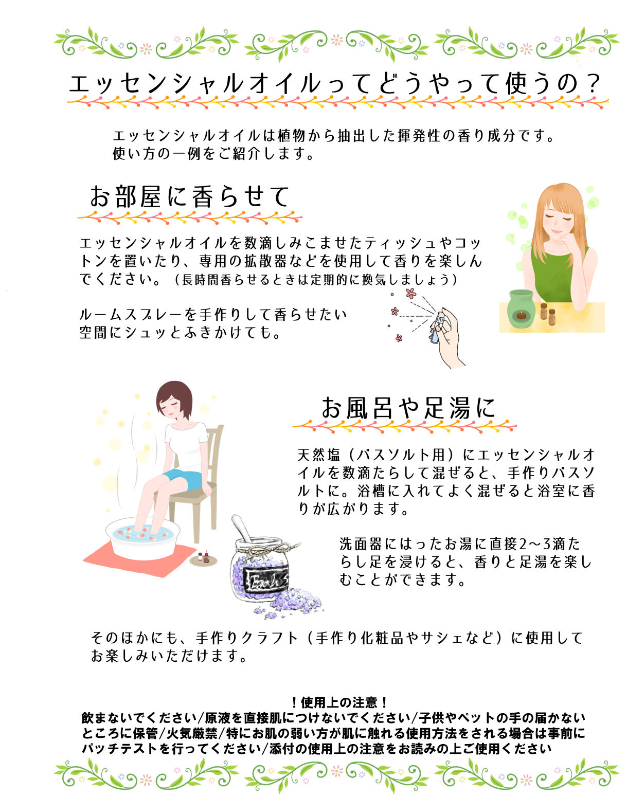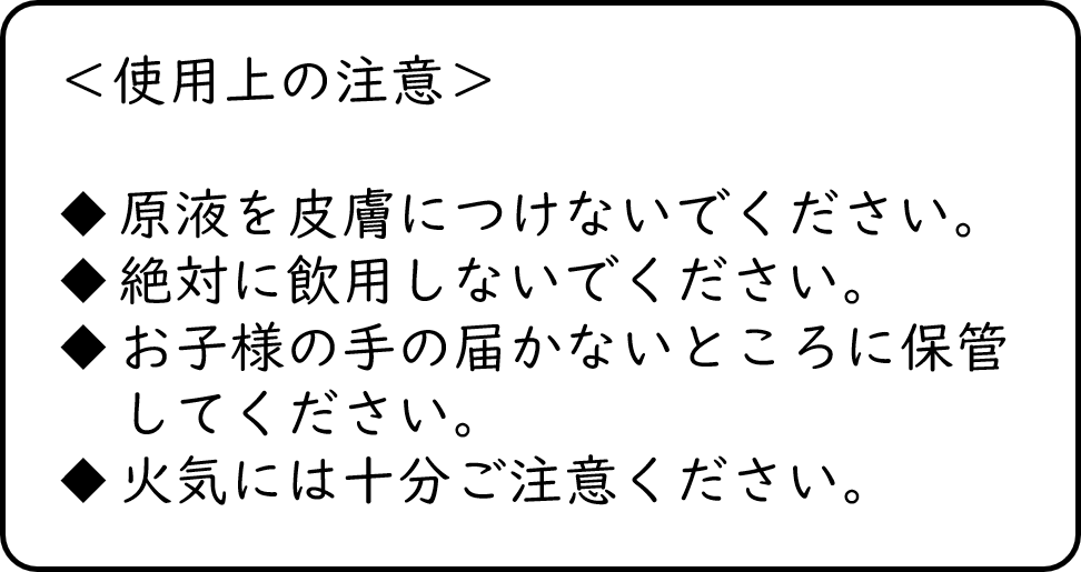 ・肌に触れるような使用方法の場合は、事前にパッチテストを行ってください。濃度は1%以下、顔や首の場合には0.5%以下でご使用ください。(1滴およそ0.05mlです)